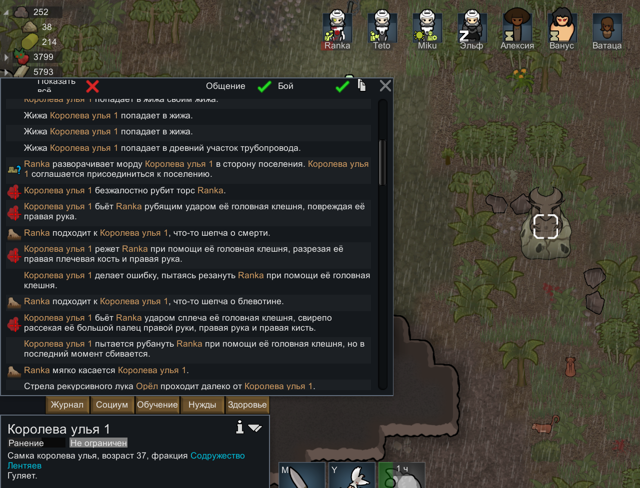 Ну я королеву улья начал тоже закидывать гранатами, потом повезло, она улетела в аут, добили остальных жуков врукопашку (плевать на потери), вытащили королеву на поверхность, там закинул в деревянный сараз из глухих стен "отлеживаться", как проснулась - мне удалось ее приручить, благодаря вдохновлению на животноводство! Урааа!