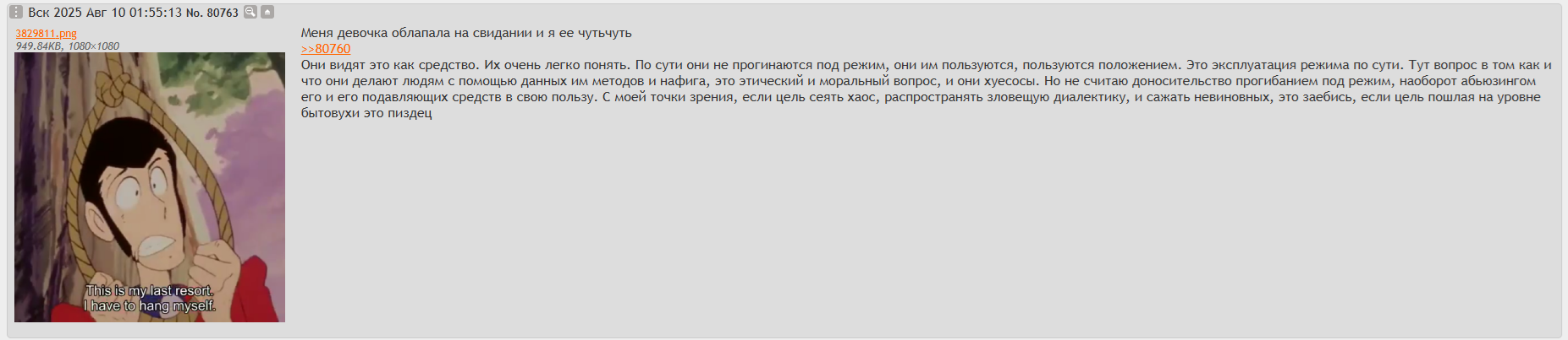 >>5606049 у меня мама с бабушкой орут друг на друга вот примерно в таком же стиле каждые пару дней, стабильно по расписанию; тематическое развитие диалогов проходит одни и те же круги, повторяются одни и те же слова; ничего не меняется, никто не заканчивает порочный круг словесного поноса, всем всё будто бы нравится, а поднимаемые темы не нуждаются в каком-либо завершении >как будто ты потерял близкого друга (не знаю каково это, …) я обычно испытываю глубокое чувство вины и отчаяния, нежели злость, в подобной ситуации. хоть предшествующее этому недолгое отрицание и может сойти за злость, но не за ярость. не знаю