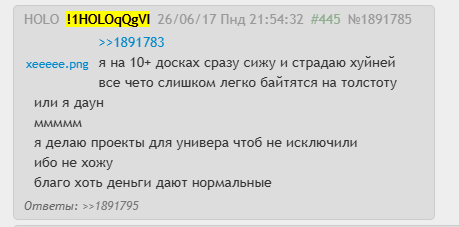 Холофаг сюда наркоманом пришел, вайпал раздел, камхорил. Его за это начали травить он расплакался убежал в чатики асилума на несколько лет. Потом его тоже оттуда пидорнули он вернулся сюда