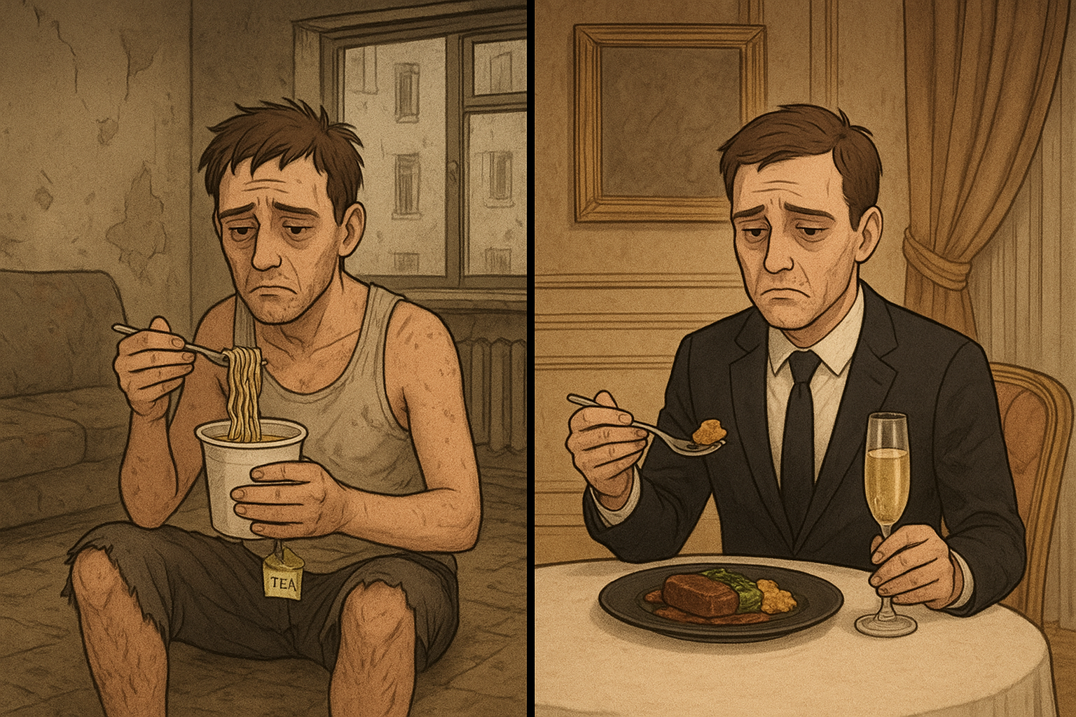 >>5613616 я ною о тчетности бытия и наступившей от этого депрессии, а не от жилищных условий. Дай мне один матрас напол, стол, два стула и даже пускай, не игровой ПК с доступом в инет, и большего не нужно. и я стараюсь по возможности не ныть давно, а смотреть что постят другие.
