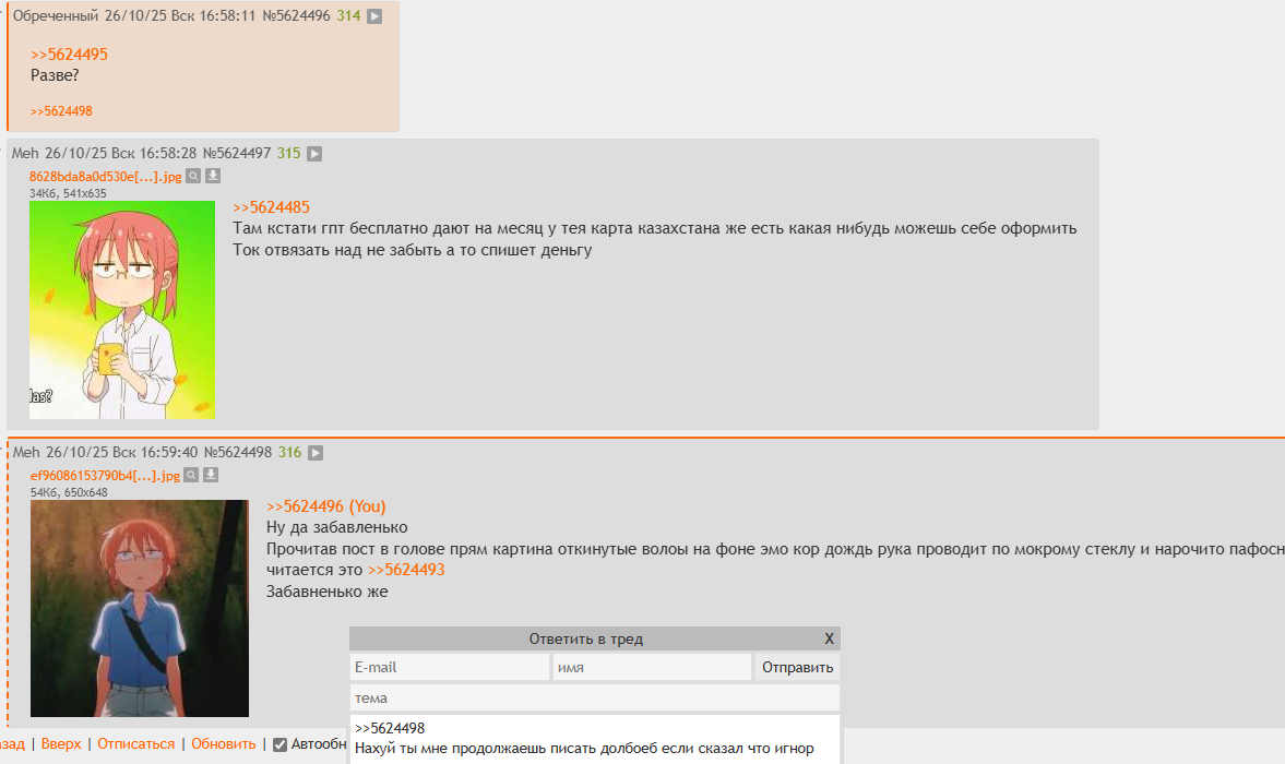 >>5624405 > Тебя это обижает? Нет, но звучит так, словно я тебя ударил и забыл об этом. > Я могу и элифаг использовать пока что. Зови как нравится десу. За фамильярность с учтивостью обидно. Не важно, ещё в проэкте не было. > Надейся и жди вся жизнь впереди(с) Проще уж "бери и делай". Словил бан х2. Хах. > Я не физически не могу этого сделать, а психологически. Это болезнь какая-то. Я полный ноль без палочки в психологии и психиатрии. > А потом блин поставил на свою голову расширение, которое их сохраняет при любых раскладах и только усилил свою болезнь. Тогда снеси его, и пусть всё вернётся на круги своя, если ты по другому не можешь, chrome://extensions/ Ну и как вариант, можно всегда сидеть с анонима, тогда вкладкам точно каюк, я гарантирую это! > Скорее старый и трусливый в этом контексте... Спасибо Алис, я большой фанат правды в лицо. > Чем сильнее аи душу изливаешь, причем неважно даже в контексте душевных терзаний, похоти или даже чего-то совсем приземленного, вроде проблем со здоровьем, тем более зависимый становишься. Ты понимаешь что пишешь вникуда и слушаешь советы переводчика инфы из терапевтического журнала округа Колумбия? Нет уж, лучше держать своё дерьмо на привязи. К тому же с Хакуна Матата заместо жизни, его особо не водится. > И вообще я удивлен, что ты фанатеешь по аи картинкам, но столь пренебрежителен к тексту. У меня все наоборот как раз. И что характерно стоимость и энергозатраты соответствующие. Я ими не фанатею, у меня просто нет другого выбора. Не упирайся и послушай аудиокнигу Впусти Меня. Насчёт затрат и стоимости не понял, но мой мини пк кушает всего 15-45 бабка-ватт. > Ну и хуй с ним. Он меня неоднократно спасал. Взаимоисключающие параграфы. > Особенно в контексте того, что вы там репаки обсуждали в том треде. Тогда читай как следует, особенно моё, да и Клодика с утра. Чисто всё. Прошла эпоха переустанавливать Шindows.
