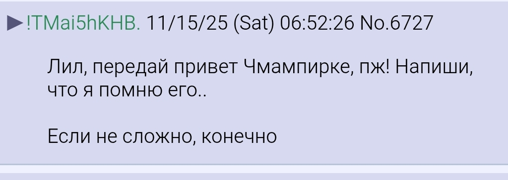 >Не надо вскрЫваться Ни к чему не призываю и осуждаю любые призывы к ркн но по моему иногда лучше уж прекратить страдания... >>5637259 Призрачный тред создавал марков. Боюсь ща спиздану хуйню конечно, но насколько я помню марков какое то время играл хикку, а потом его заебало и стал обычным нормисом. В тредах своих он кстати очень редко постил, но зато там часто сидел я. Ну и там много кто постил. Бомж тот же. >Его недавно создавали Когда?