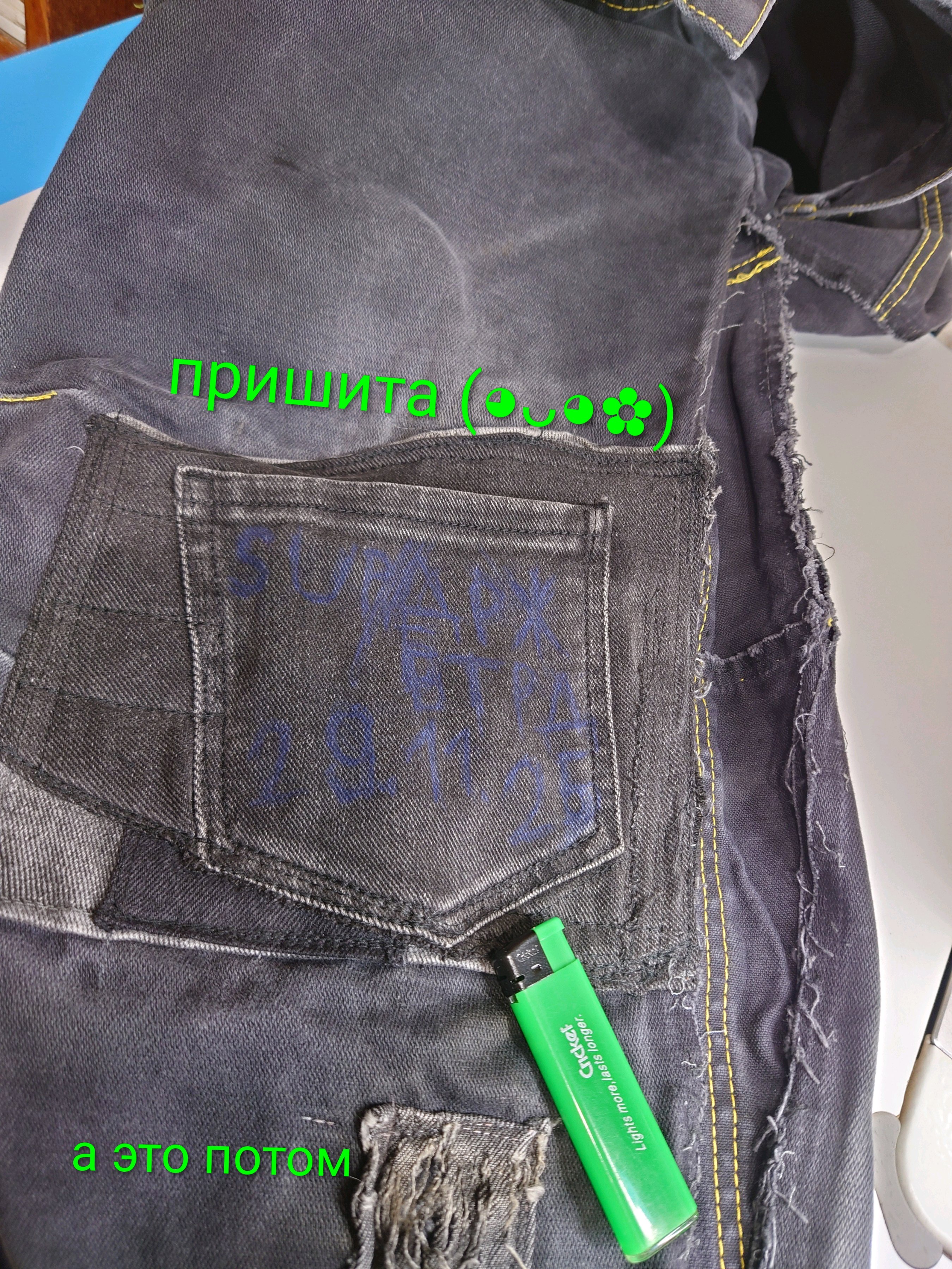 Привет дружботред! Сегодня весь вечер чинил работягам робы. Последнюю на сегодня (вчера(.❛ᴗ❛.) не закончил, поздно уже, спать пора. У работяги видно тяжёлая работа и его старве заплатки протёрлись и прожглись насквозь до ткани самой брючины, мне пришлось распарывать кем-то зашитые после прошлого ремонта швы. Из коробки с тканями для заплаток мне попались задние карманы джинс и я решил пришиь эти карманы на место заплаток. Пространство снизу зашил обычными заплатками, естественно с подшитыми углами, чтобы было красиво. Этот мучжчина явно мнго и изматывающе работает стоя на коленях, сдирая их до дыр и чем-то прожигая, поэтому было решено сделать ему дополнительные карманы для всчких мелочей + карман - это 2 слоя ткани, и так ткань на коленях дольше ему прослужит. Такой вот подарок и может быть забота из уважения за труд от меня ему, хоть я его и не знаю и никогда не видел 。◕‿◕。 Разметка на кармане специальная и легко стирается утюгом. Завтра я доделаю эти штаны. Как-то вот так :)