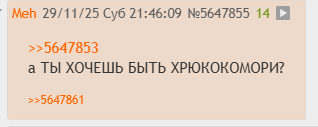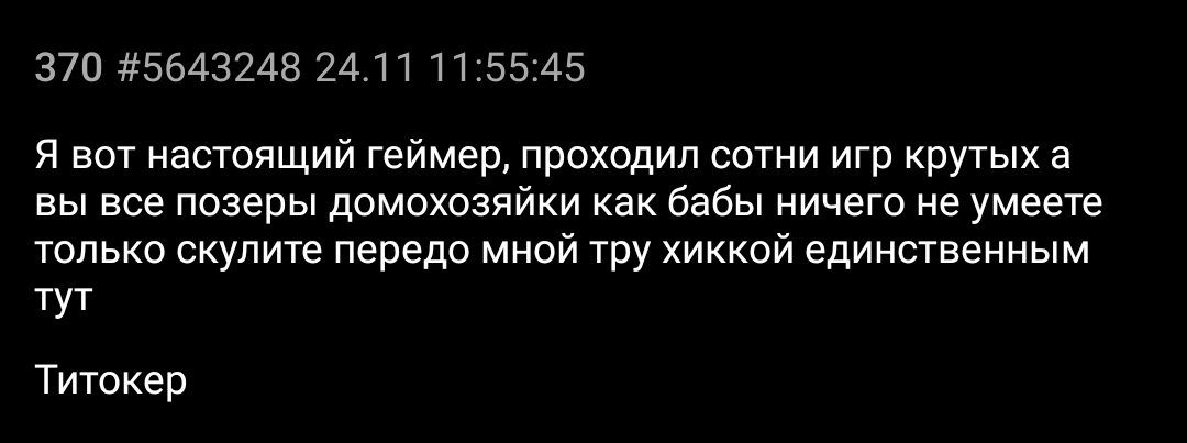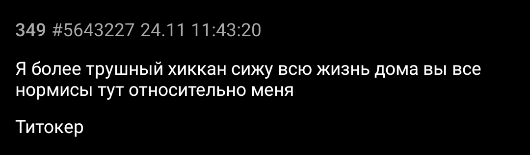 Меня на словах типа хейтят всем на меня всем похуй итд. Но по факту, даже понифаг сюда приходит с другой борды и читает все что я пишу. И он перестал практически про своих телок писать там у себя из-за этого (я же в его треде ни одного поста не написал). Я самая авторитетная фигура в хикканском ру сообществе