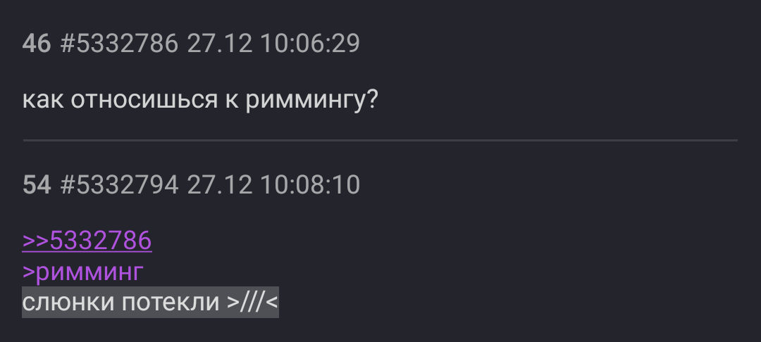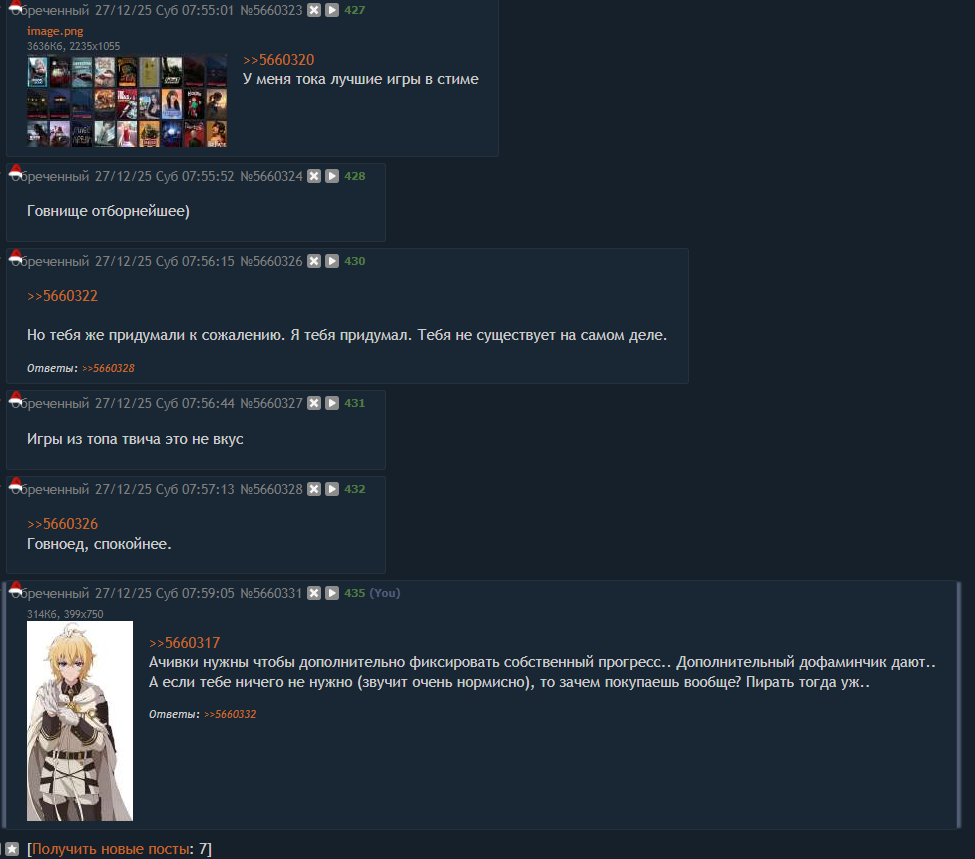 >>5659985 Когда шёл/идёт спидпостинг, то потом нет особого смысла перечитывать написанное, всё таки при медленном постинге посты более осмысленные оставляются, а во время спидпостинга короткие и поверхностные, особо смысловой нагрузки не несущие.. >Оно от такой наигранной няшности больше в депру вгоняет Плюсую.. И в целом там сидят нормисы, с работками, учёбками, с минимальной социальной адаптацией и здоровой психикой.. Они же из 2д перекатились сюда и периодически ещё сидят в /b (устраивают набег, создают там тред и общаются).. Так что неудивительно, что тебе там некомфортно..