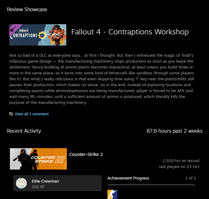 >>5659533 Почему сразу "показушный", что за проекции?.. Для себя крафчу и для своего ОКР, которое не переносит вида вот этого пустого кружка.. И успокаивается, удовлетворяется только при виде надписи "You have leveled this badge to completion.".. Иррациональная трата денег, это так, но что поделать, психика так работает..