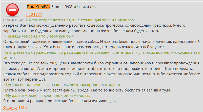 Так об этом же в тру каноничном определении хиккикомори с википедии написано. Что тру хикканы это люди, чья изоляция не из-за психических заболеваний. А он как бы и ссылается на это определение, и себя записывает в хикканы, и сам себе противоречит лицемерит. И вот вопрос, почему с таким лицемерным человеком общаются некоторые аватарки, и полностью игнорируют факт его лицемерия