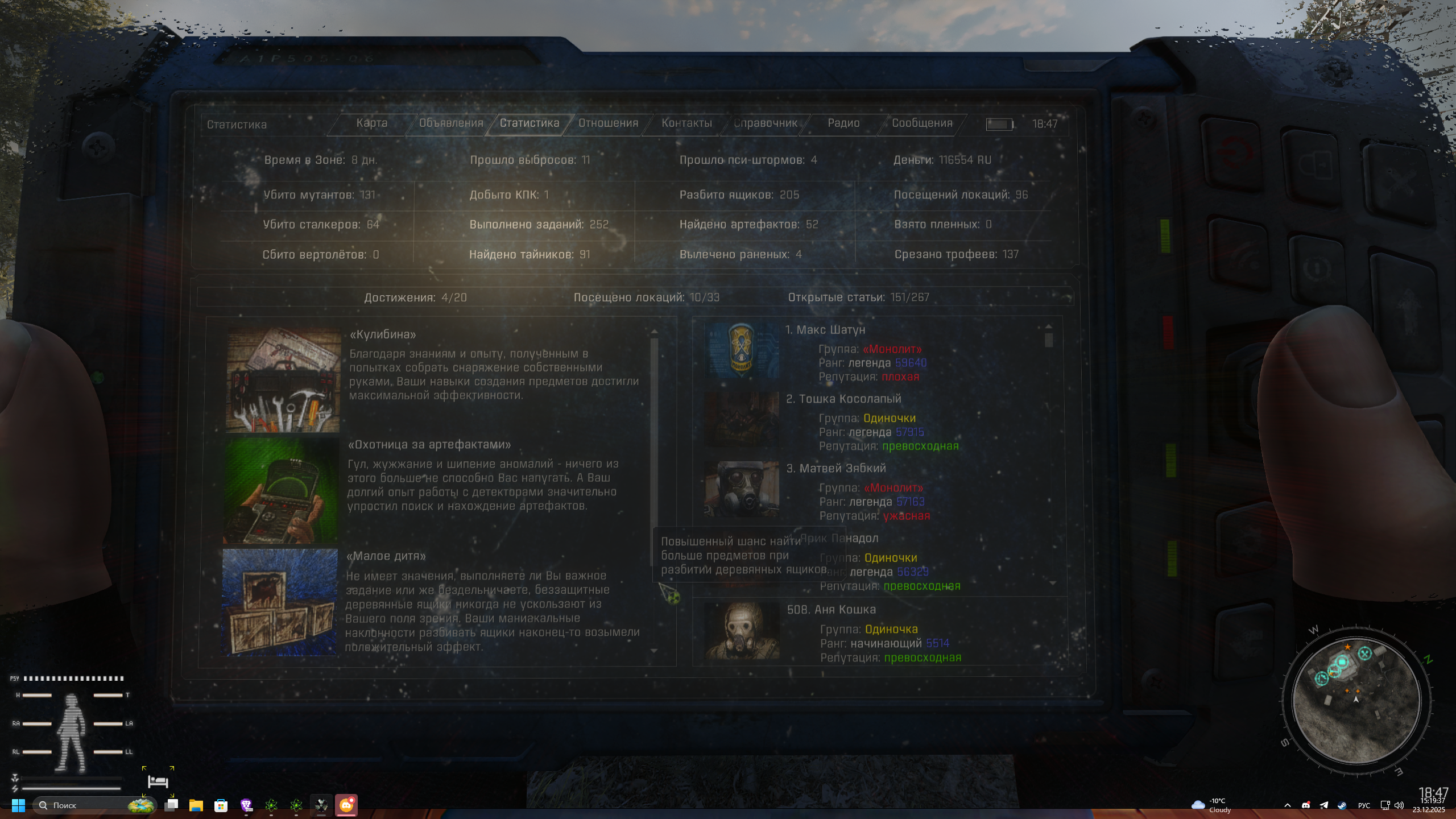 сижу, тренирую свою дурочку для использования маскировки 2 из 3 достижений по крафту уже есть, третье требует инструменты для калибровки, а это швах достижение охотницы за артефактами есть скоро должно быть достижение расхитительницы тайников все достижения должны давать небольшие бонусы к соответствующим характеристикам