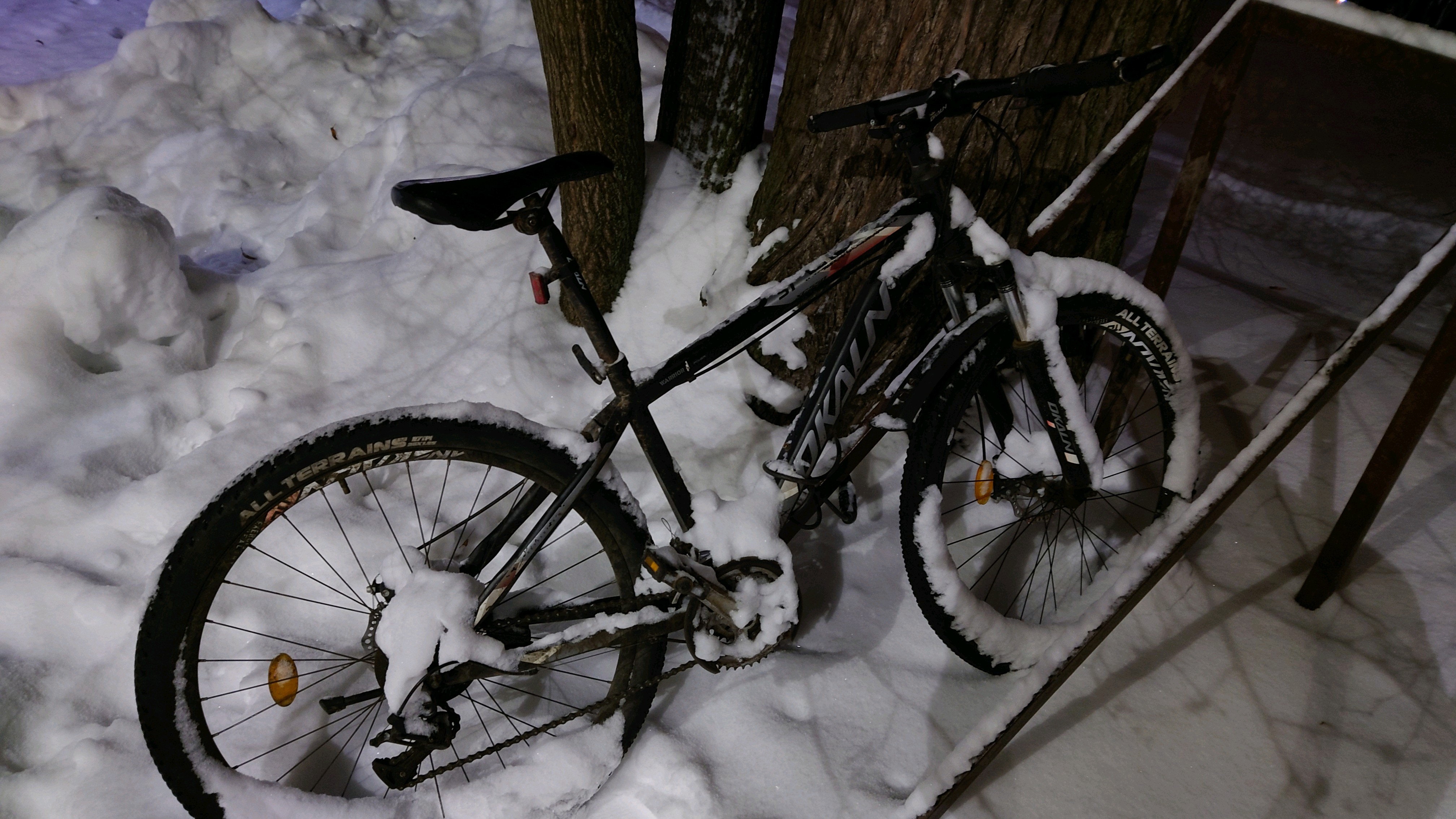 Сегодня как обычно шил и потом ночью пошёл гулять. На фотографиях всё светлее чем было ирл. Он сточл забытый в парке дней 10. Вытер перчаткой седушку от льда и сфотографировал. Руки у меня всегда холодные, пока телу всегда жарко, руки могут как лёд, на улице мёрзнут до боли. Старый добрый механизм снова дома.