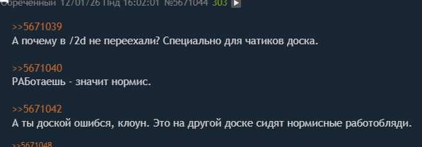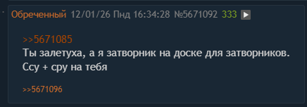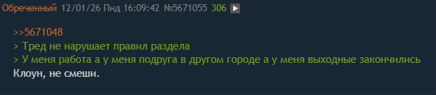 >>5675659 Два анончика в начале декабря поссорились. Один поворчал, пообзывался и забыл, а второй... Ополчился на весь тред и вот, в общем, оно. Уже скоро третий месяц как его кроет.