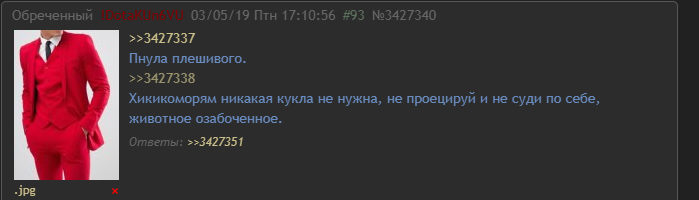 P.s. подхрюкивающий женатик из-за угла это конечно жалкое зрелище. P.p.s субъект сидит только в хиккитреде и никуда не выходит. Но пошел изучать посты в полускрытом треде, выискивать что-то, что теоретически могло касаться его и срать туда на пару с тиктокером.