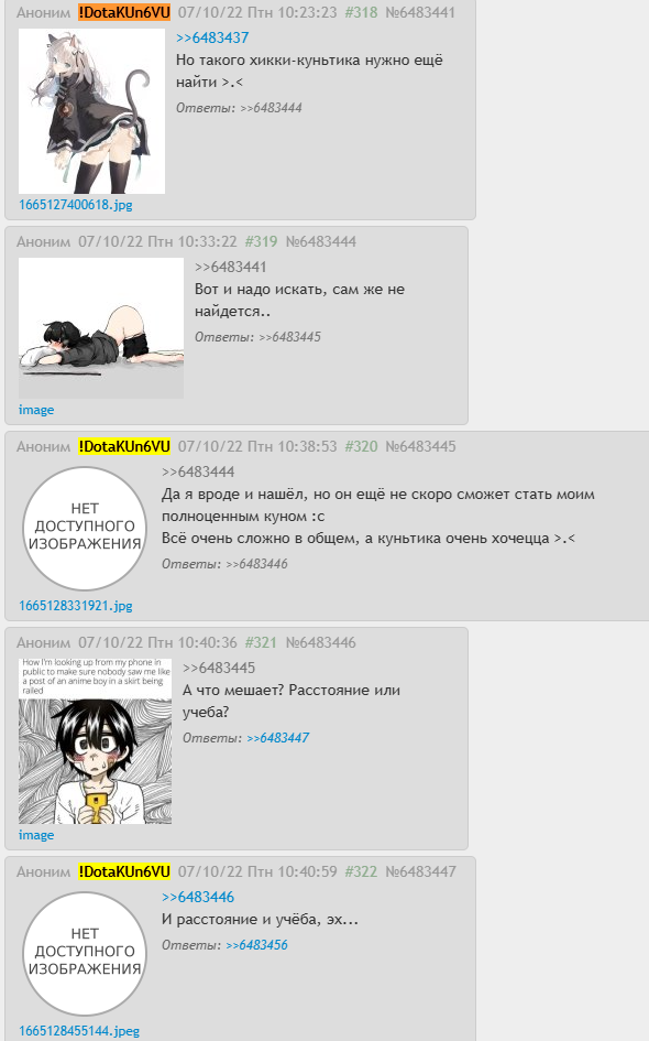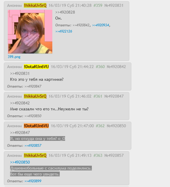 Ладно, я уже всё сказал, дальше только повторятся по 10 кругу. Всё еще считаю что это детский сад, потому что было не в /rf, и в эпоху когда Селюк превратил раздел в помойку хуже /b. Пизданюх (авророчмо, дилдокер) в те времена просто внаглую аватарили своим лицом, пока меня выдавили за хиккиборцунство. ЛилАврил - тоже самое, еще рассказывал вот буквально недавно, 1.5 года назад, как круто "целоваться с тян", про наркоту, вписки и школьниц с которыми он трахался. Про других тоже молчу. И ничего, почти никто с тем же ЛилАврилом не разорвал общения, продолжили с ним миленько общаться, никто его и не подумал травить и осуждать. Где был наш "обреченный хикикомори" тогда? Да и сейчас я что-то не видел чтобы Лила кто-то травил, когда он подписывался как "ЛилХикка" и издевательски писал в каждом посте "Я хикка". А я тут должен часами, десятками часами, сидеть и "оправдываться" за прошлое, да еще и в другом разделе. Каждый переиначивает определение хикки под себя и под то как ему удобно, меж тем я всегда был каноничным хиккой согласно определению в вики. Хочется написать что "бог всё видит", но его нет, равно как и справедливости в этом мире.