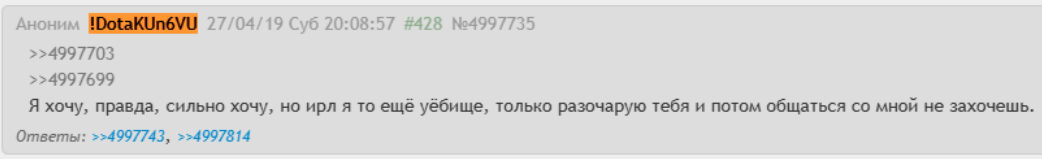 >какое то мнение олдов Да, мнение тех кто всё это застал вживую. Ко мне у них не было особых претензий и вопросов. Потому что понимали, что фотки в раздел не постил, что троллил инцелов, что щитпостил, рольплеил и фантазировал. Тогда такой раздел был - песочница, которая с приходом селюка скатилась в антихикканскую помойку, вот тогда мне стало не до шуток, ведь там были настоящие социобляди с фотками из бани, которых крышевал Селюк. Ты если олд, то должен это всё понимать сам.