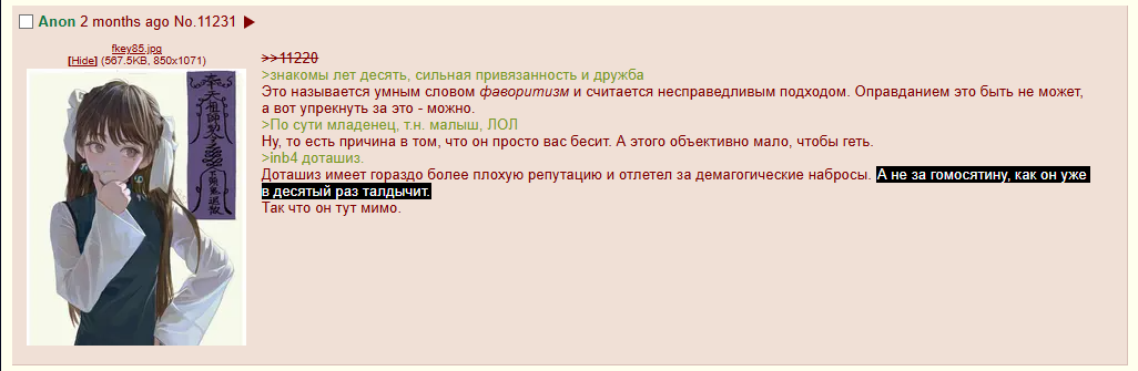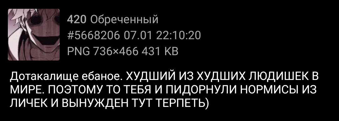 Кого, Дилдокера? Волан-де-Морта? Или почему боишься назвать конкретное имя, трусишка? Меня подразумеваешь? Сиди в своем бараке, где вы сами забили на собственные правила и по сути разрешаете постить любому кто вам нравится (и запрещаете любому кто вам не нравится), и не отсвечивай, тихушник. Что происходит здесь в /rf тебя волновать не должно. Сейчас-сейчас, забанят затворника которому больше некуда идти, просто потому что так захотел обиженный лицемер, ага. Тебе наплевать кто затворник, кто нет, тебя не волнует справедливость, лишь бы тебя родненького ничем в прошлом не обижали — вот твой главный ресентиментарный критерий, а ваши так называемые правила и описание борды это просто фиговый листочек, чтобы вводить в заблуждение ньюфагов. Будь человек хоть 100 раз затворник с нулевым социальным капиталом, если при этом он тебя чем-то обидел, его нужно "банить" и ему "не место" среди вас. Очень здравомысленно и по-взрослому, совсем не мелочная мстительность.