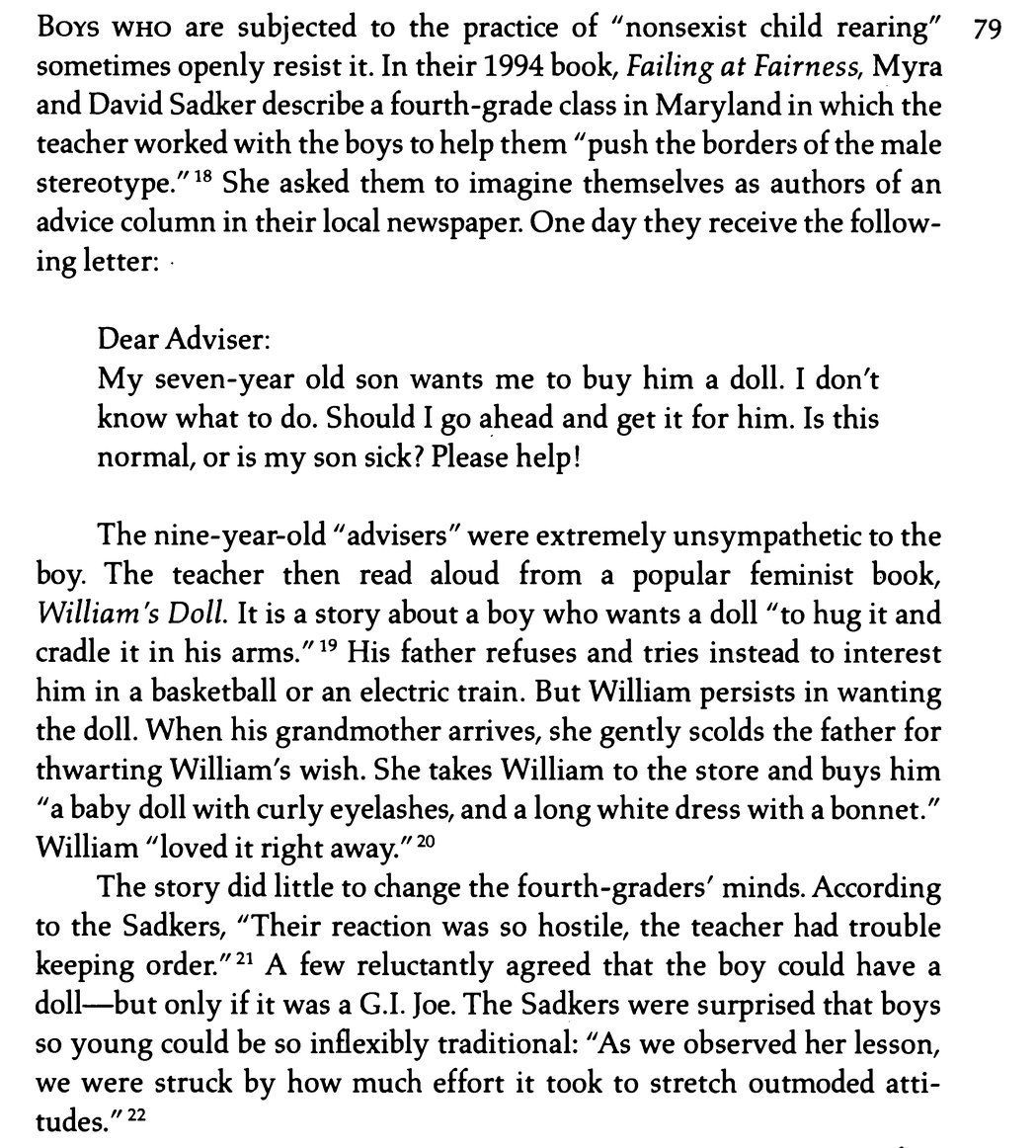 >>131827 > в Совке и странах постсовка Не только. В книге Кристины Хофф Соммерс «The War Against Boys: How Misguided Feminism Is Harming Our Young Men» есть целая глава о том, как феминистки заставляют мальчиков играть в куклы и как это убивает всю маскулинность. Ещё можно просто поискать в гугле что-то типа «my son wants a doll» и найти кучу постов типа «I fear that my son might be gay».
