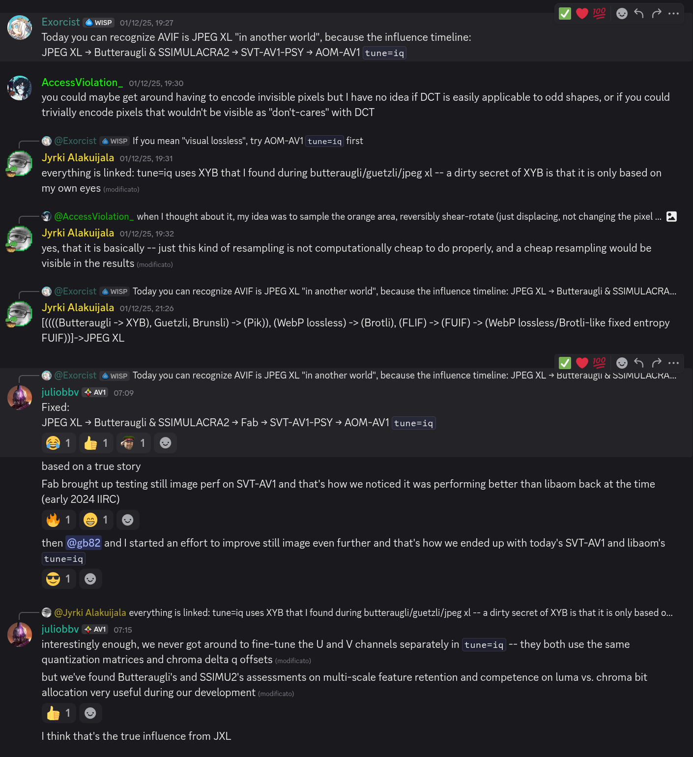 Основные фичи формата: - Сжимает на 60% лучше, чем JPEG. - Сжимает без потерь на 35% лучше, чем PNG. - Он может транскодировать jpeg изображение без потерь туда и обратно. Транскодированное JPEG XL изображение весит на ~20% меньше оригинала. Это значит, что можно спокойно пережать все свои фотки, не потеряв ни бита информации. Таким больше никто не может похвастаться. - Поддержка прогрессивного декодирования (актуально для веба. Наполовину загруженная пикча уже выглядит хорошо) - Анимации (замена гифок). - Почти полнота по Тьюрингу (если бы не ограничения на максимальный размер обрабатываемых пикселей). Это позволит почти бесконечно оптимизировать формат. Пикрил в формате JPEG XL весит всего 117 байтов! И по факту является программой по его генерации, написанной вручную. Больше подобных пикч можно найти в комьюнити Discord сервере. - Свободный формат, а это значит, что его может использовать кто и как угодно. Его уже можно активировать в Chrome, если включить флаг enable-jxl, и в ночных сборках Firefox. Также его поддержка уже добавлена в Gnome. Для винды тоже есть вьюеры. Про Plasma вообще без понятия (скорее всего тоже есть).