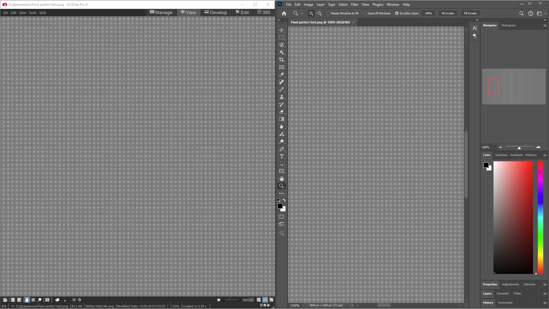То же самое успешно провернули Фраерфокс и Цент (они тоже Per-Monitor v2, как и Фотошоп) - тоже уровень зума поменяли, но когда я подогнал зум - pixel perfect показали.