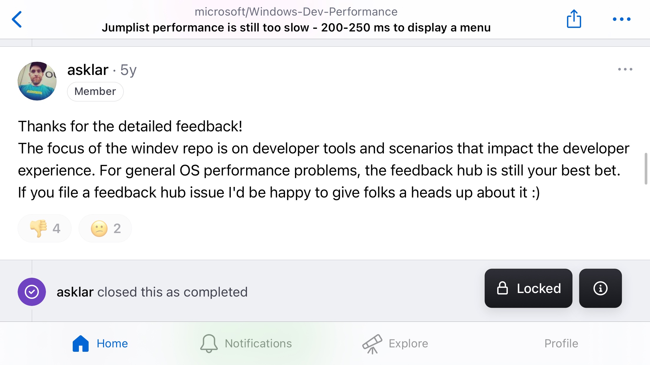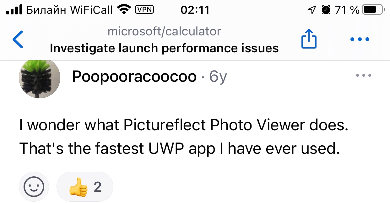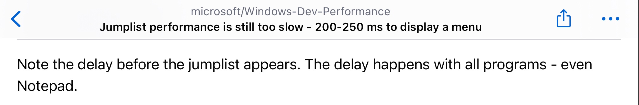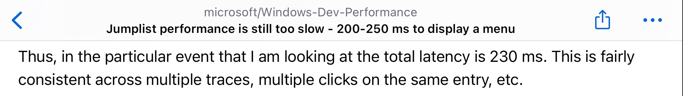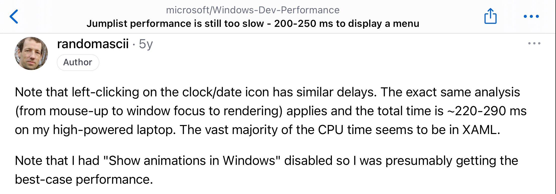 >>3606196 >при первом вызове конт. меню файла на рабочем столе Проблема более глобальна. Это лаг в целом проблема оптимизации WinUI. В 11 большую часть переписали под него, поэтому вся система такая тормозная. Любое UWP говно имеет задержку примерно в 200 мс и индусы видимо пофиксить это не могут. Отсюда и лаги проводника, вкладок в диспетчере задач, того же контекстного меню. В 10 оно тоже начинало появляться, при открытии контекстного меню на панели задач, например.