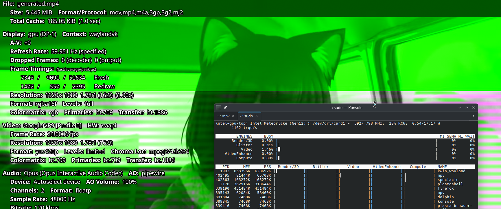 Поставил себе арч кде плазму, на вейланде второй моник артефачит когда пишу что-нибудь в терминале или когда перетягиваю какие-нибудь окошки. От окошек след остается, а текст просто нечитаемый, иногда и вовсе пропадает. Поменял вейланд на х11 и нормально стало, правда теперь окна неудобно закреплять. Но два монитора нормально работают, плавно без подергиваний, это реально круто. Причем на нвидии.