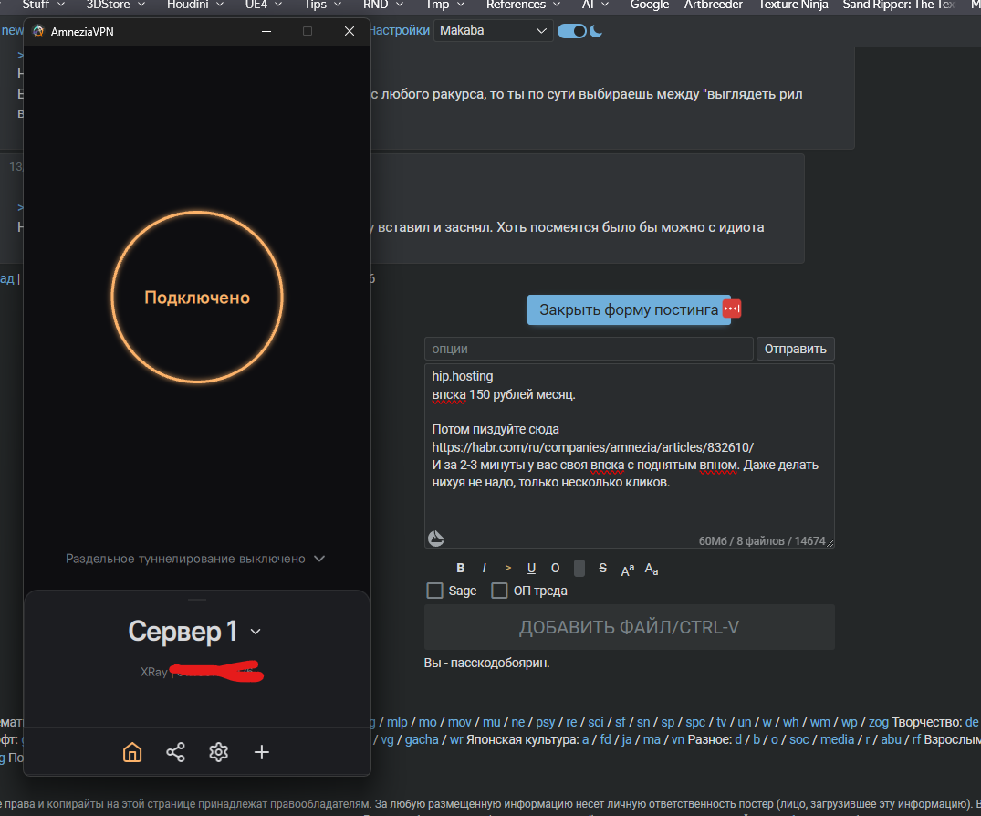 >>3611934 >пердолиться с настройками VPSки, VLESS и прочего 0. Проплатить вас. 1. Скачать амнезию. 2. Вбить реквизиты сервера и подождать 20 секунд установки.