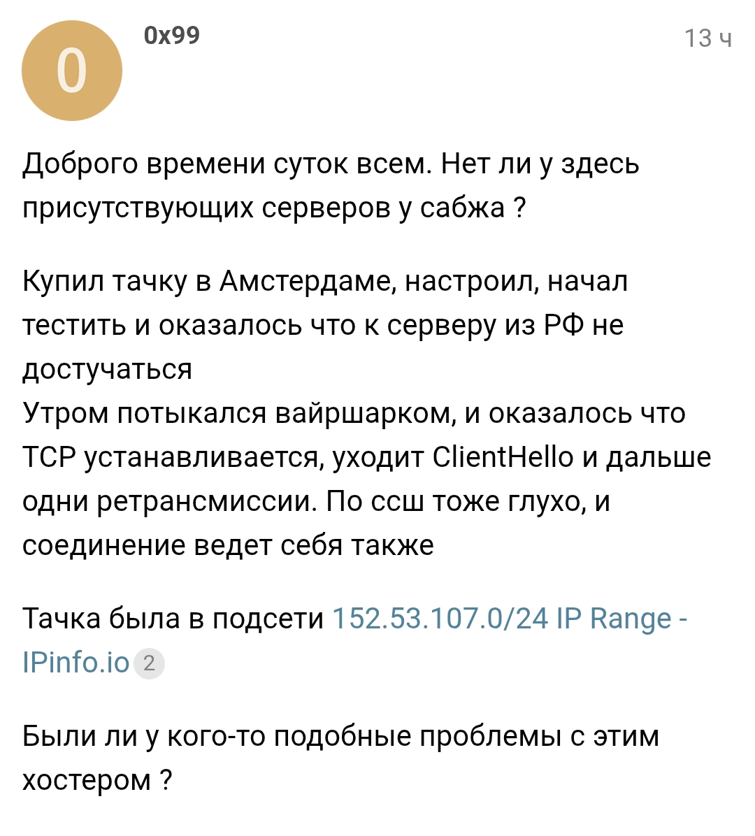 >>3614890 Видел новость с мейл ру, уже не найду ссылку, что это делается, чтобы дорогих россиян не дудосили. Кекус. Вот валдик рассказывает: >С OVH ситуация иная, и началась она раньше, 28 мая. К его блокировке приводит отправка любых UDP-пакетов на адреса других хостинг провайдеров, например, Scaleway/Online.net. Фильтр включается на 10 минут и блокирует HTTPS-запросы целиком (не давая скачать 16 КБ), блокировка повторяется при повторной отправке UDP-пакетов. >Scaleway нередко используют для торрентов, в котором применяется протокол поиска «соседа» DHT, работающий через UDP, из-за чего просто запущенный торрент-клиент (даже не скачивающий или раздающий файлы) может послужить причиной срабатывания блокировки — но это не единственный возможный вариант активации фильтра. >Проблемы проявляется у разных провайдеров и регионов по-разному: где-то блокируется только OVH, где-то остальная тройка, а где-то только два из четырех.