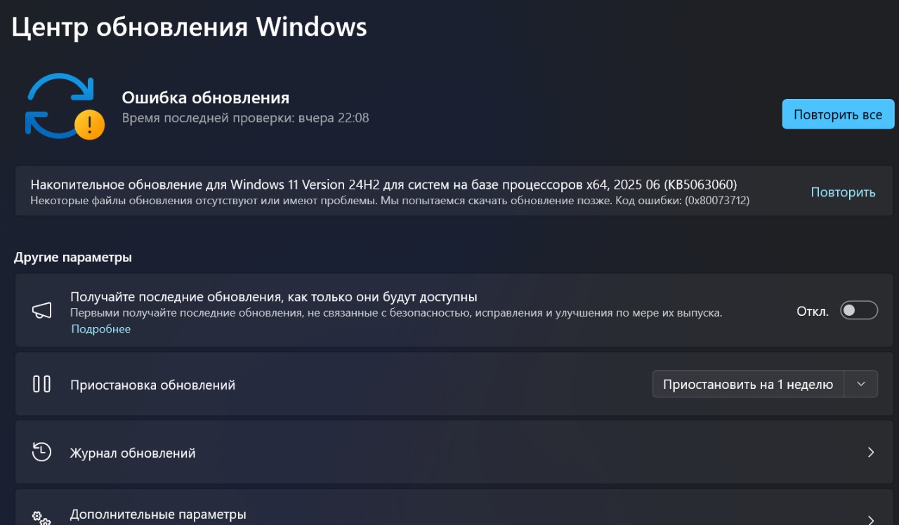 >>3614044 Короче переустановил начисто с удалением всех данных. Теперь проблема другого характера - после загрузки и попытки установки обновы пишет, что файлы обновления отсутствуют или имеют проблемы и ошибку 0x80073712. Я уже и "sfc/scannow пробовал, и "DISM/Online/Cleanup-Image/RestoreHealth"... Ни-ху-я. Просто какой-то пиздец. У меня уже возникают мысли, что может, это мой ноут не тянет обнову по железу? Всё же дешёвенький.>>3614044