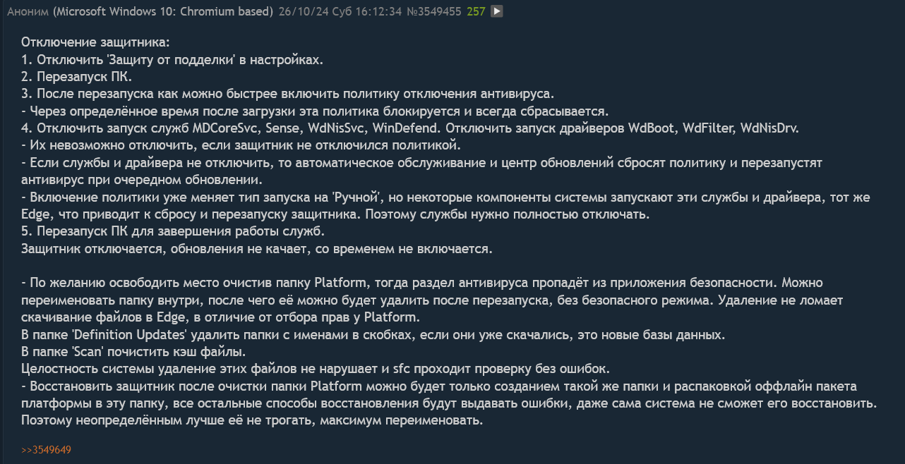 > Про унаттенд знаю, я через него в10 иот лтск себе делал Хуйня унаттенд, особенно способ отключения Defender, там нет службы MDCoreSVC и отключения smartscreen.exe. Верный способ сломать систему, используя уннатенд шныренса. Вот нормальные способы, если всё-таки задумал отключить >>3618655