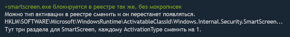 >>3620547 >особенно способ отключения Defender Это лучший способ из всех. Таким образом дефендер никогда не запускается и начальный скан не делает, даже кэш с логами не создаётся при первом запуске. Я бы дополнительно ещё добавил отключение политикой после запуска системы, чтоб он уведомления не показывал. >там нет службы MDCoreSVC А она уже нужна? Потому в образе этой службы никогда не было и приходит она только с обновлением дефендера. Дефендер не работает, обновления не получает, служба не появляется. >и отключения smartscreen.exe И тут тоже лучшим вариантом будет добавление этих reg команд в unattend, потому что без отбора прав или System аккаунта ты доступа не имеешь к этим ключам в реестре, в разы меньше пердолинга. >Верный способ сломать систему, используя уннатенд шныренса Чем там её можно сломать? У шниганса наоборот адекватный подход и лютую пердольщину он не добавляет в генератор.