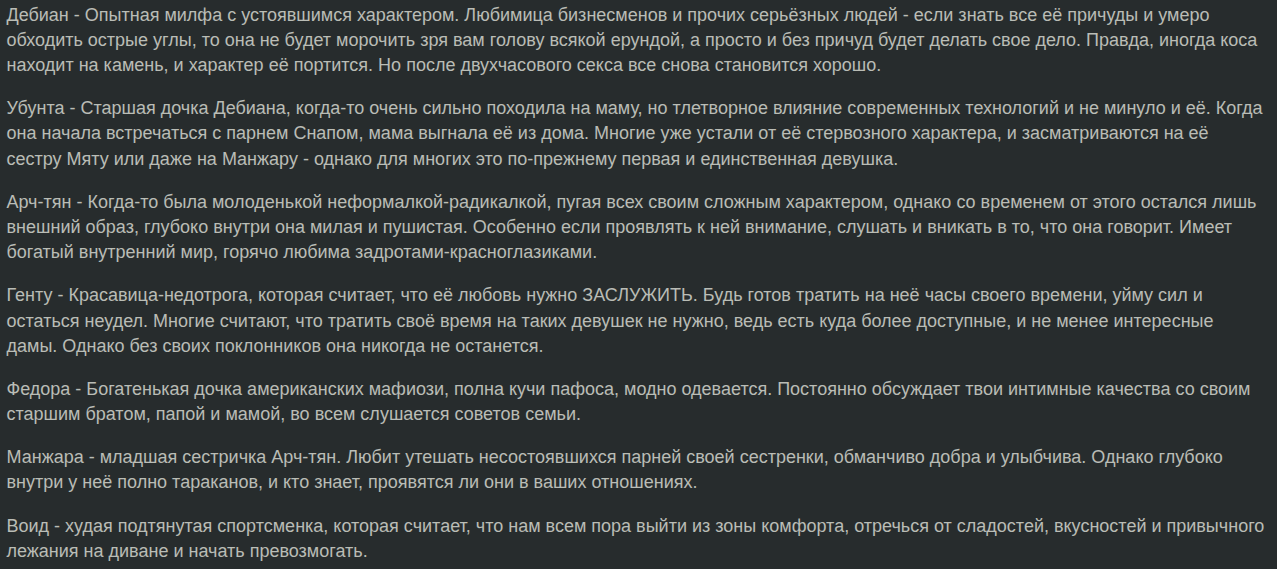 >>3622801 Slackware - Худая, суровая девушка. Говорит мало, но метко. Старой закалки, презирает новомодные штучки и никогда не упрощает то, что можно сделать руками. Живёт по своим правилам, отвергает гламур и всякий пафос. У неё всё работает, хоть и не сразу понятно как. Не терпит глупости, держится особняком, но если ты в беде поможет молча и эффективно. Самоуверенна до грубости, но честна до конца.