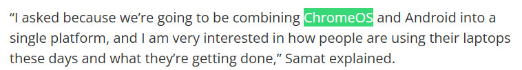 У Гугла началось слияние ОС, которое надо было закончить 10 лет назад, а ещё лучше не делать Хром ОС изначально, сразу допилив универсальность Андроид. Текущее слияние растянется на пятилетку минимум сразу же, потому что это неповоротливый Гугл, у них всегда так, они ничего не умеют ни сразу, ни быстро, поэтому и гора провальных проектов и многомиллиардные потери, хотя это одна из ведущих сегодняшних суперкорпораций, да ещё и с такой поддержкой от гос США.