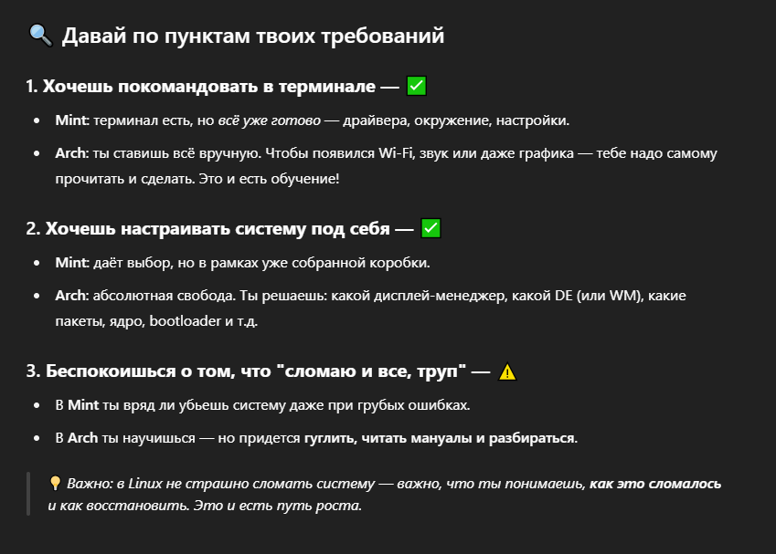 Привет, я тут решил вкатиться в GNU/Linux и спросил ChatGPT. Можете подтвердить правоту в его ответе? Или посоветуйте дистрибутив сами.