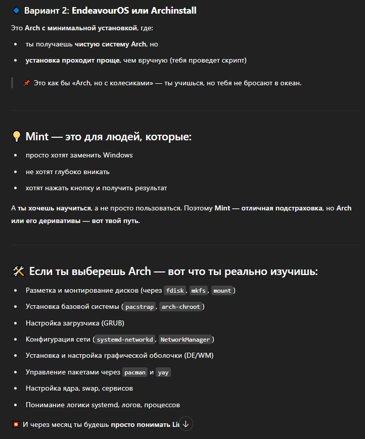Я реально сомневаюсь насчет выбора Mint, но может он все же необходим, чтобы для начала просто потыкаться в системе? С виндой я давно на "ты" и она скучная. Сижу на LTSC, знаю про активацию, полезный софт, немного лазил в реестре по гайдам. Я конечно не гуру виндовс, но и не средний юзверь, который не знает как поставить ос/драйвера/квн и пользуется яндекс браузером.