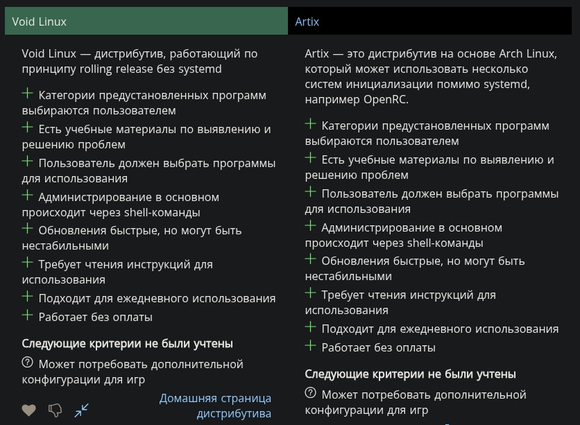 А, ну еще, кстати, я год назад примерно этот тест проходил и он мне тоже выдал Void Linux на 1м месте. Я тогда еще решил изучить тему и вот чем мне этот дистрибутив не понравился. Его у главного мейнтейнера отжали и подхихикивали над его проблемами, что он с женой разводится. К тому же он не популярен и его разрабатывает очень маленькая и токсичная команда, которой не хватает времени дистром заниматься. И, видимо, в следствие низкой популярности, под него пакеты никто не собирает.