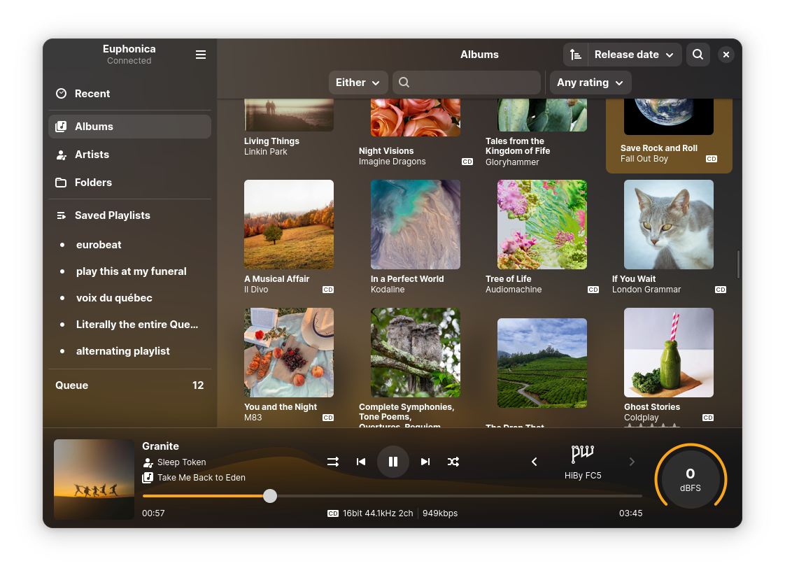 >>3626765 >>3626784 У тебя на скрине кал какой-то. Музыкальный плеер должен в первую очередь отражать аудиоатеку по альбомам (должен показывать обложки), работать с метаданными.