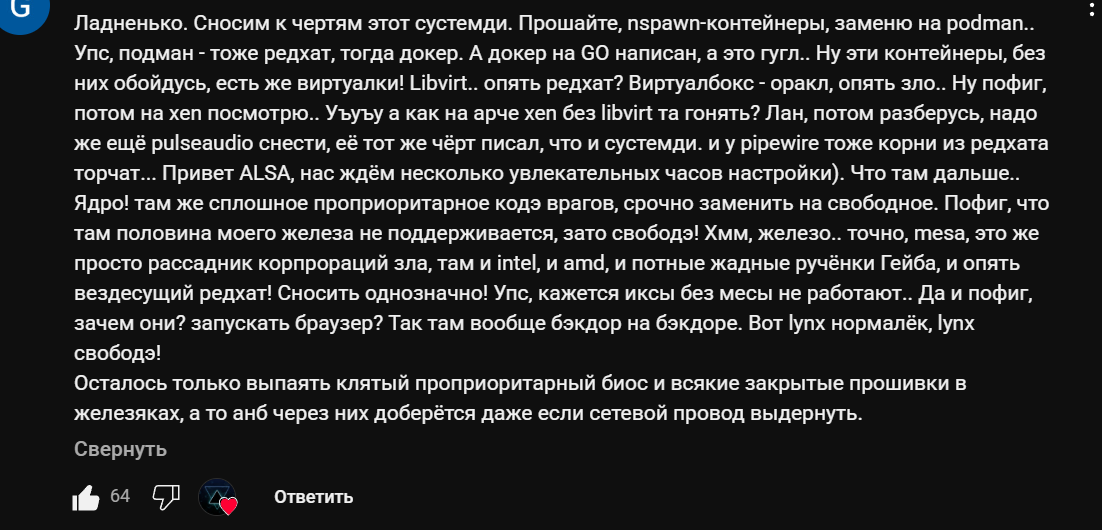 >>3626851 все эти кукареки про systemd абсолютно лишены смысла просто потому что локалхостовая чепуха не понимает что и для кого это сделано, ее мир ограничен проссаным зинкпадом, ей очень сложно принять неприятную правду о том что десктопный линукс это в общем-то побочный выкидыш где все работает исключительно за счет объедков с энтерпрайзного стола с примесью жира из складок габена.