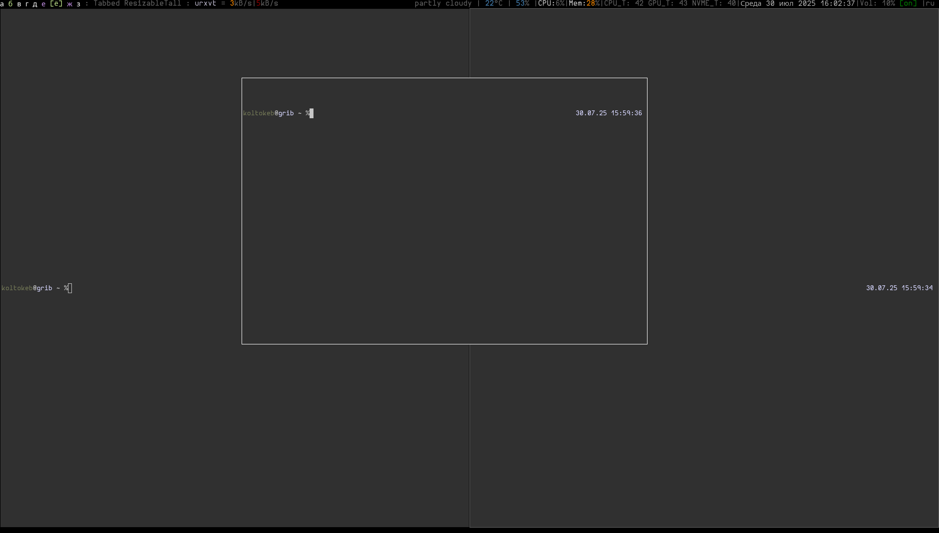 Вопрос к тем кто пользуется тайлингом на Вяленом: какая панель? Просто Waybar это кусок ссанины на фоне Polybar для иксов. Для всех остальных: вернуться на Иксы не вариант, а от тайлинга я не откажусь, мне так удобнее. Разве что воткнуть тайлинг в LXQT.