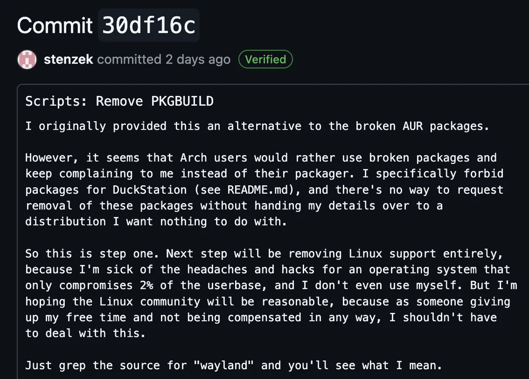 - Не контрибутят в апстрим, дрочат свои локальные костыльно-велосипедные форки - Не шарят конфиги и не собирают их в общую репу "удобного для среднего пользователя и объясняющего самого себя UI" - Не собирают и не шарят списки самых часто устанавливаемых после наката ОСки пакетов (любят ебаться с запоминанием названий всякой мелкой хуйни видимо) - Не делают ничего для возможности мгновенного отката хуёво установившихся обновлений (разве что наконец-то догадались некоторые сделать CachyOS и Arkane Linux с Immutability, но и там никакой совместимости с крупным и более-менее нормально поддерживаемым ostree)