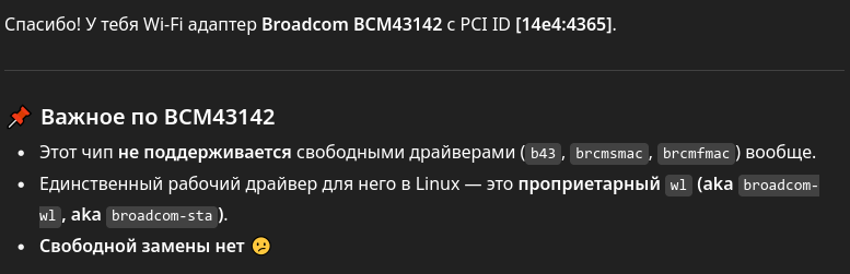 пиздец, хули так плохо wifi работает, скорость интернета 10кб/сек, оставил ноут на ночь, просыпаюсь, а он пароль просит, дебил сука, я подозреваю это из-за драйвера broadcom-wl, нейронка сказала что стоит только терпеть, примечательно что на винде wifi на том же ноуте нормально работал, я думал линукс это прошивка для роутеров, а он даже к интернету нормально подключиться не может