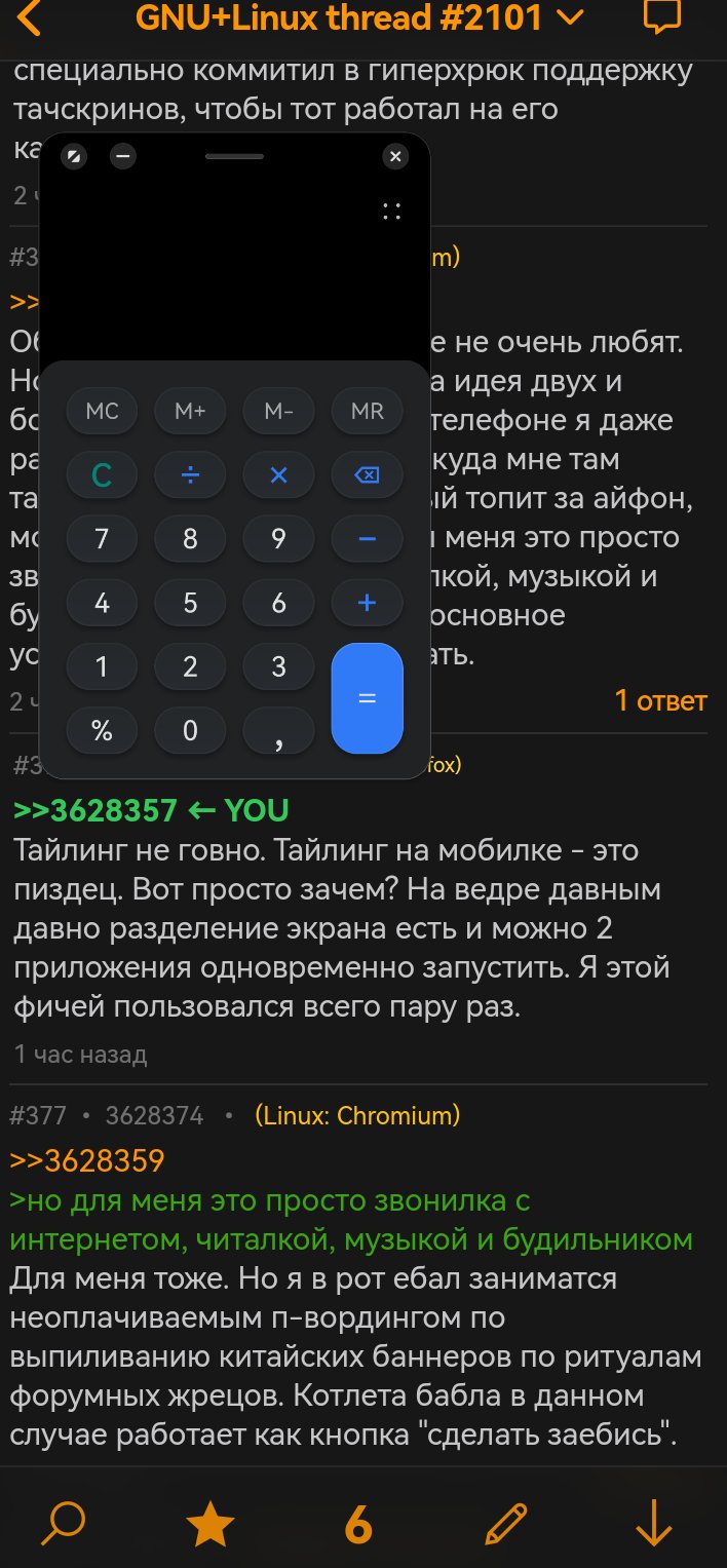 >>3628355 Обычный тайлинг как-то тоже не очень любят. Но, если на компе мне удобна идея двух и более связанных окон, то на телефоне я даже разделителем не пользуюсь, куда мне там тайлинг? Мсье сверху, который топит за айфон, может хоть порваться, но для меня это просто звонилка с интернетом, читалкой, музыкой и будильником. Т.е. вообще не основное устройство, на которое насрать.