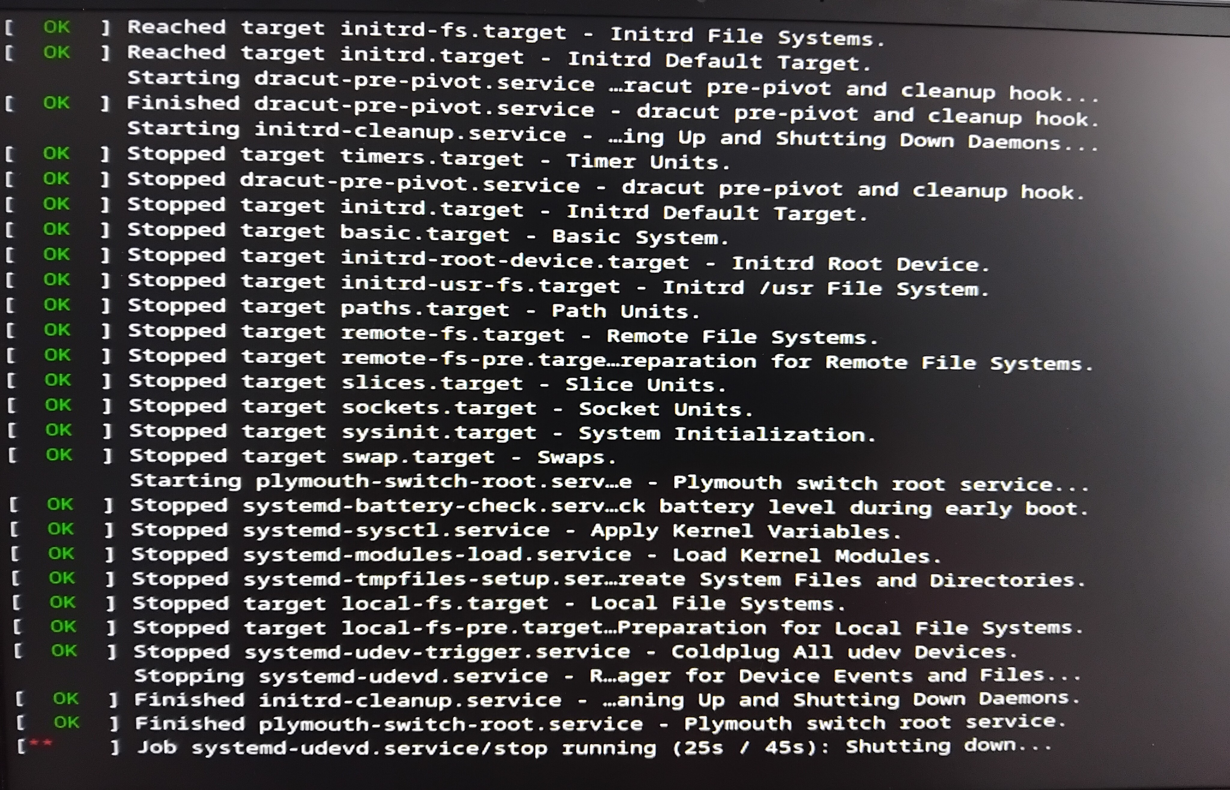 И что теперь делать ноут больше не грузится повисает на >Job systemd-udevd.service/stop running (25s / 45s): shutting down и на этом всё, намертво