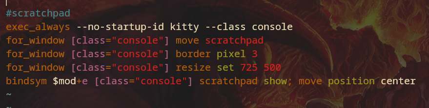>>3628614 Блядь проще показать. Вот часть конфига i3. Первое распределение по рабочим столам. Второе это правила для окон, в том числе и плавающих.. Третье это запустить консольку , задать ей класс, запихнуть в скрачпад, и задать ей нужные мне параметры размера.