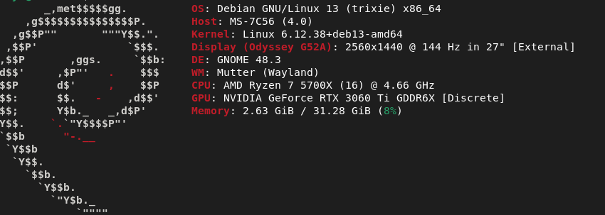 >>3629004 Продержался полтора часа в этом п-мире, послушал музыку и записал видео, после чего поспешно выключил. Ну, цифра немалая, обычно это приключение лишь пару минут занимает: включил → консолька → hyfetch → скриншот → запостил в интернет → выключил.
