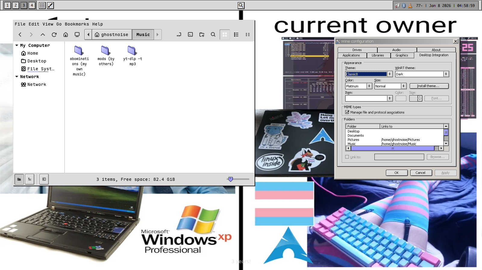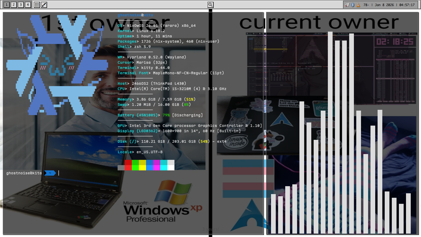 >>3589431 Ага, как Винда, только не Винда. Ты почти что победитель по жизни. В unixporn только не лезь. Там народ хотя бы pywal использует чтобы цвет консоли сочетался с обоями, была прозрачность, подбирают обои так чтобы прозрачность не мешала различать текст. И всё дефолтное, на выбор: fastfetch, btop, cava, cmus, ranger, чё там ещё из прикольно-консольного есть? Я искренне рад что тебе кайфово пользоваться Минтом, но это не очень. И дело даже не в том что то что у тебя на скрине это плохо, оно должно быть просто функционально для тебя и вообще пофигу на остальных, а в том что ты стал соревноваться с Виндой на её поле.Тебе ну нужно сравнивать себя с сыном маминой подруги, тебе нужно быть сыном маминой подруги..