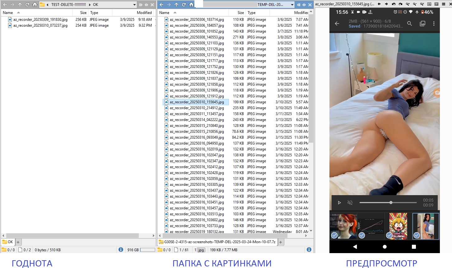 >>3592198 Дано: - Папка с картинками (1000 шт.) Задача: - Просмотреть и отсортировать годные в отдельную папку за минимально возможное количество нажатий. Без выскакивающих диалоговых окон с путями, "ОК" и т.д. - Важно иметь визуальное подтверждение перемещения в виде растущего второго списка файликов.
