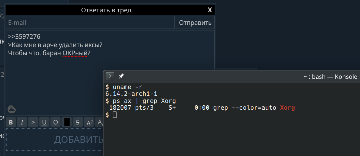 Вот этого >>3615345 петушка не слушай. Чё-то там брызжет слюной, кудахчет и пытается строить из себя олда, но его максимум - накатить арч по гайду, подкинуть дотфайлы для модного тайлингового вм и скриншотов наделать с фастфетчем.