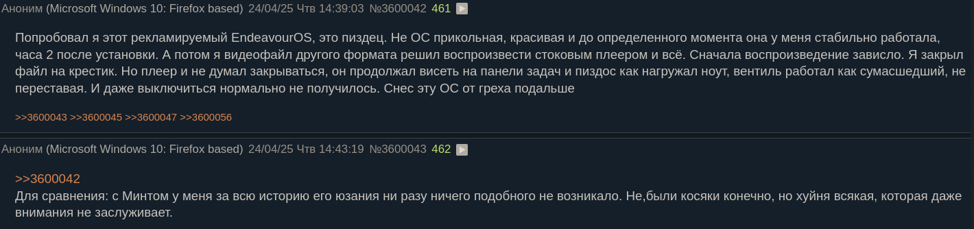 >>3619193 >Если ты с чем то не согласен можешь писать в спортлото. Мне не жалко если кому то нравится играться с арчем, пожалуйста, но блять советовать его для знакомства с линуксами/переката с шинды это уже диверсия против популяризации десктопных линуксов. Агрессия и выебоны этого чела мне не нравятся, но тут он фулл прав. Хотите перекатить человека на линух - отправляйте на минт/манджару. С арчем только зря наебется, а практической пользы авг юзеру от свежих версий если честно мало. Я бы даже сказал, что наоборот, регулярные обновления всякого говна людей в основном триггерят. Единственный плюс это как раз то, что лишнего говна по дефолту поменьше, но опять же, для ньюкека который привык к базовому софту винды это звучит не как плюс, а наоборот.