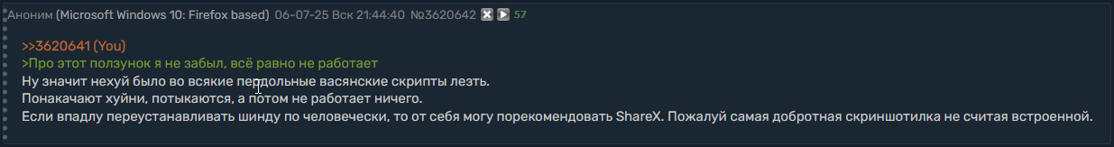 >>3620641 >Про этот ползунок я не забыл, всё равно не работает Ну значит нехуй было во всякие пердольные васянские скрипты лезть. Понакачают хуйни, потыкаются, а потом не работает ничего. Если впадлу переустанавливать шинду по человечески, то от себя могу порекомендовать ShareX. Пожалуй самая добротная скриншотилка не считая встроенной.