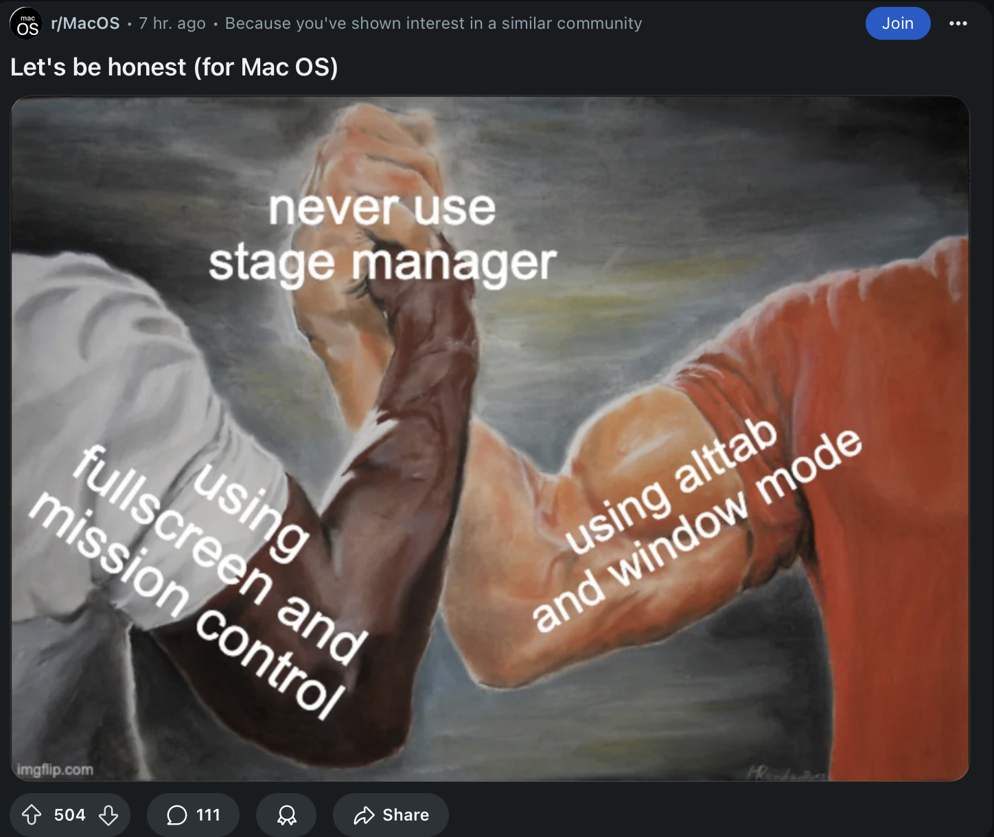 >expose >mission control >stage manager Все что угодно, только не нормальный альтаб запилить. Нельзя же как в винде сделать. У нас, пидорасов, свой путь, жрать говно с нескучными анимациями.