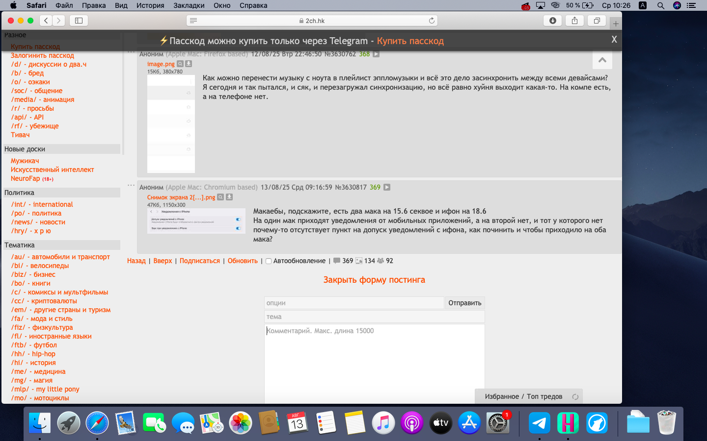 Макаебы, подскажите, есть два мака на 15.6 секвое и ифон на 18.6 На один мак приходят уведомления от мобильных приложений, а на второй нет, и тот у которого нет почему-то отсутствует пункт на допуск уведомлений с ифона, как починить и чтобы приходило на оба мака?