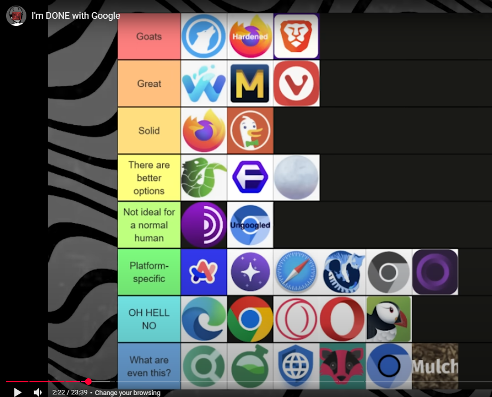 >>3621707 Какой-то додик делал тир лист, пальцем в небо. >Goats - LibreWolf >Great - Mullvad Где логика нахуй? Почему так? >Solid - DuckDuckGo >OH HELL NO - Edge Он знает, что утка это скин поверх эджа?
